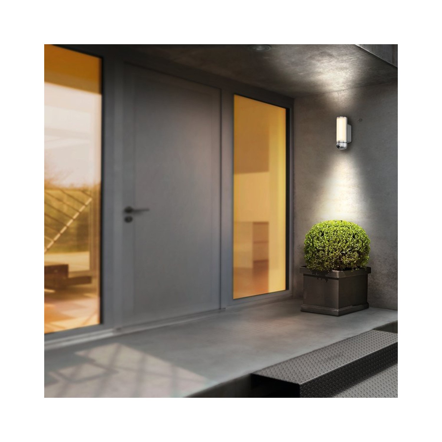 - Combines outdoor surveillance and lighting with an intercom