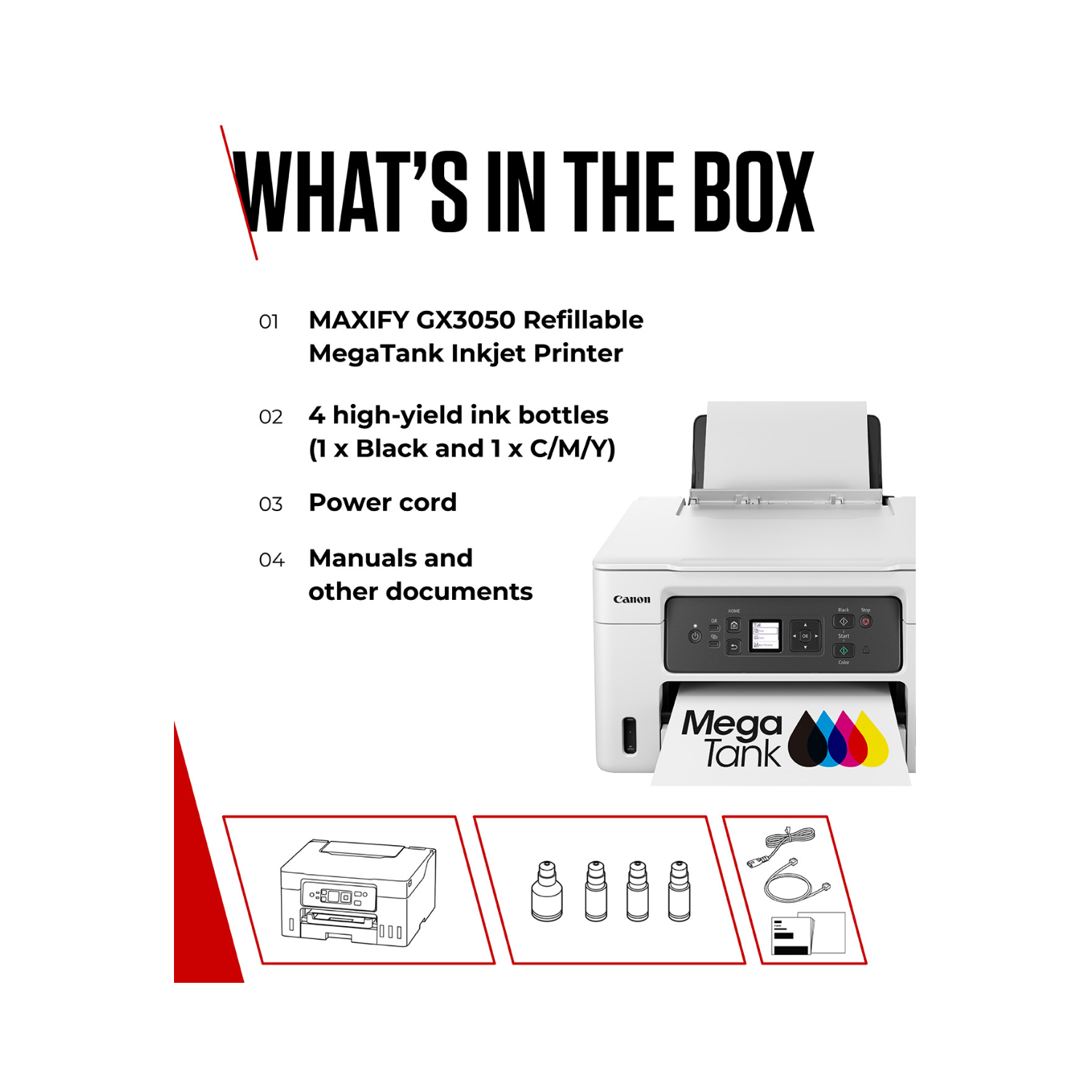 Built for productivity, the MAXIFY GX3050 offers fast print speeds that help keep work moving. Whether producing multi-page reports or regular office documents, the printer maintains efficiency without sacrificing quality, supporting smooth day-to-day operations.