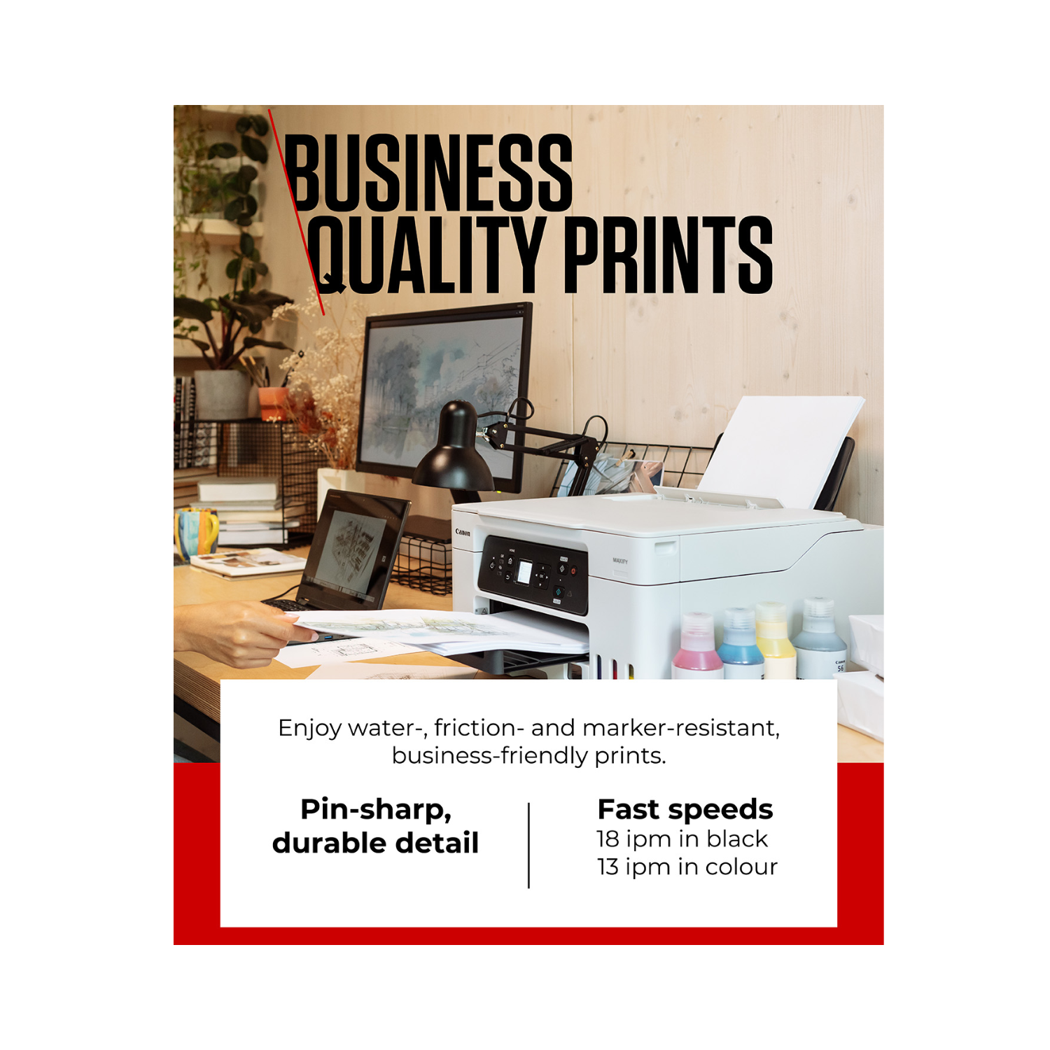 The printer delivers sharp black text and vibrant colour documents suitable for reports, presentations, invoices, and marketing materials. Canon’s precision inkjet technology ensures consistent print quality across a wide range of document types, providing reliable results for business environments.
