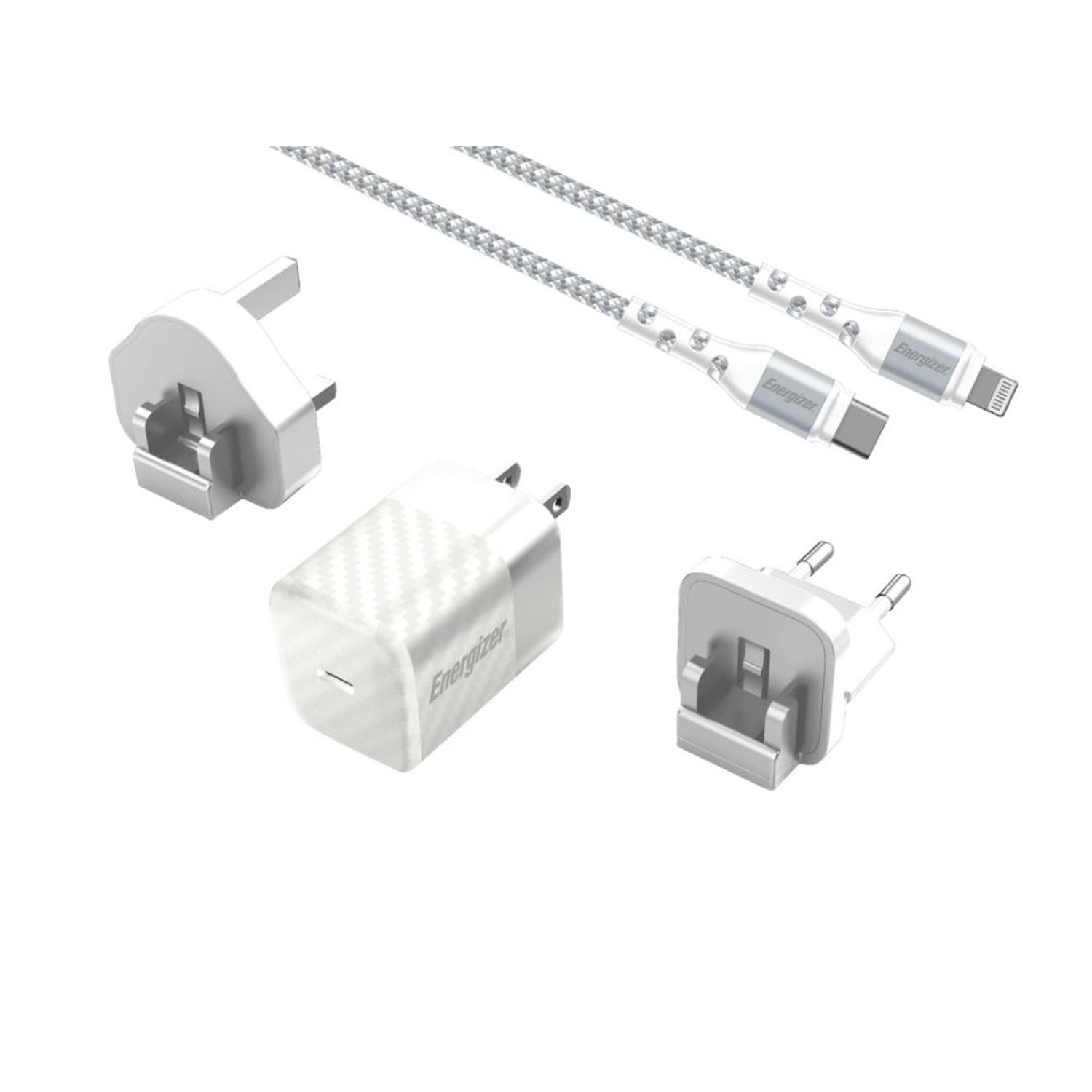Energizer 20W Wall Charger with EU/UK/US Adapters with Lightning Cable - White