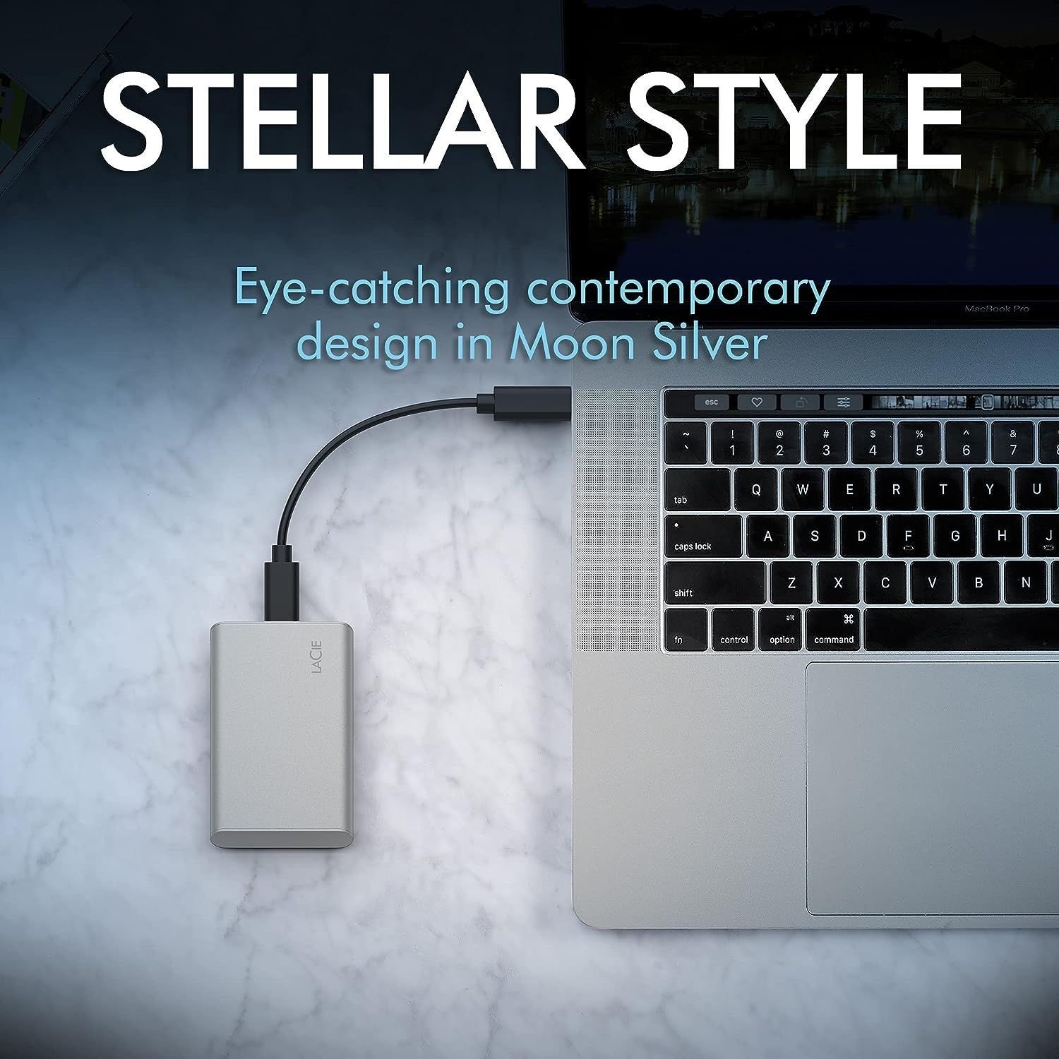 Compact for easy portability with up to 2 TB of storage and an eye-catching minimalist design, the LaCie Portable SSD in platinum compliments your laptop.