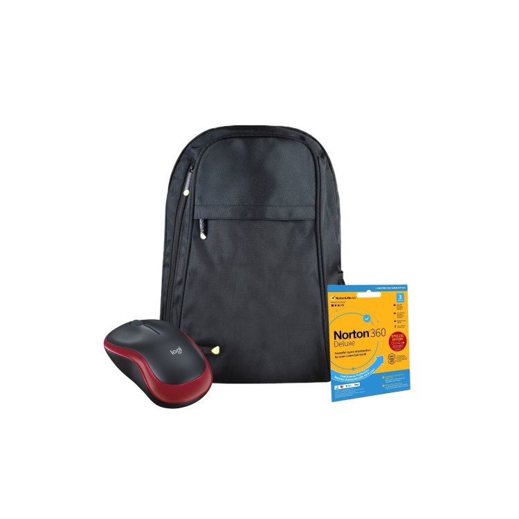 Logitech M185 Wireless Mouse in Red with Norton 360 Deluxe Internet Security and Tech Air Classic essential 14 - 15.6 Inch Backpack in Black