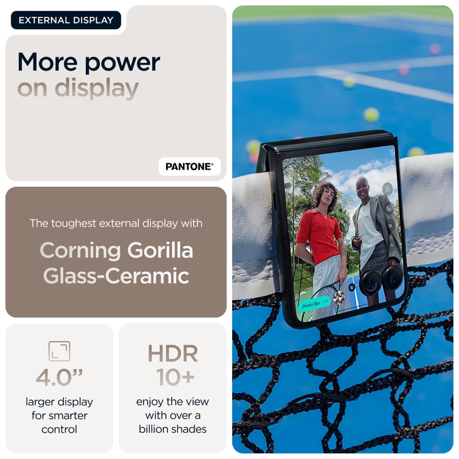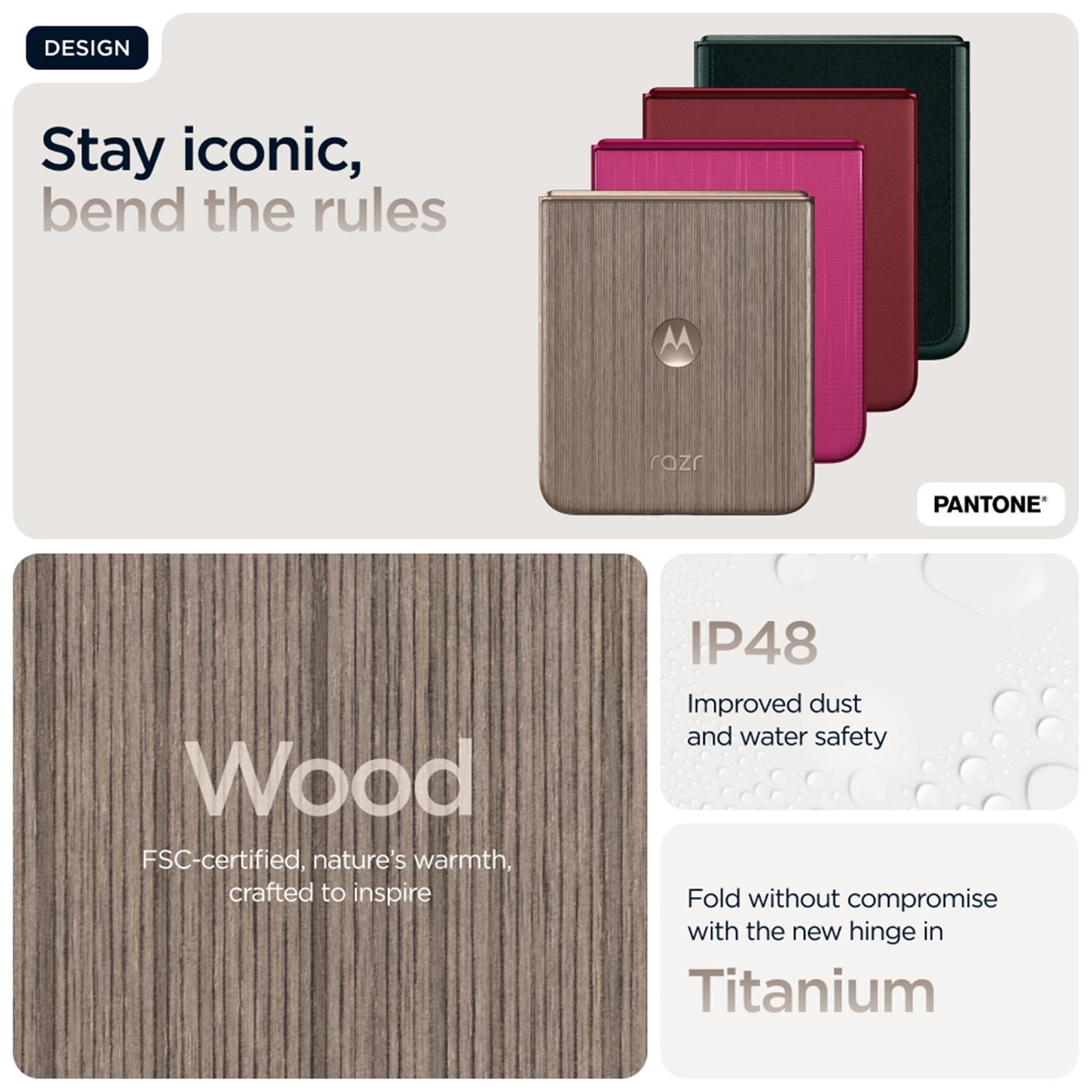 <b>Make it iconic</b><br>Make it smarter. Make it faster. Make it even more iconic. Introducing the motorola razr 60 ultra. Ultra-compact and exquisitely crafted, it features distinctive finishes such as Alcantara(43) and real wood, all in specially curated Pantone Colors. Easily access your favorite apps on the most intelligent and interactive external display. All without having to flip open your phone. Capture professional-level photos and videos and enjoy personalized assistance thanks to the seamless integration of moto ai(1). Accelerate everything with industry-leading Snapdragon® AI performance. And get the fastest charging of any flip phone(2) thanks to 68W TurboPower™. The new motorola razr 60 ultra. Make it yours.