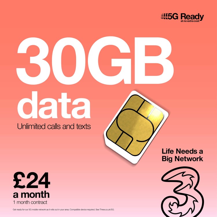 Three 30GB Data SIM Only Contract 1 Month