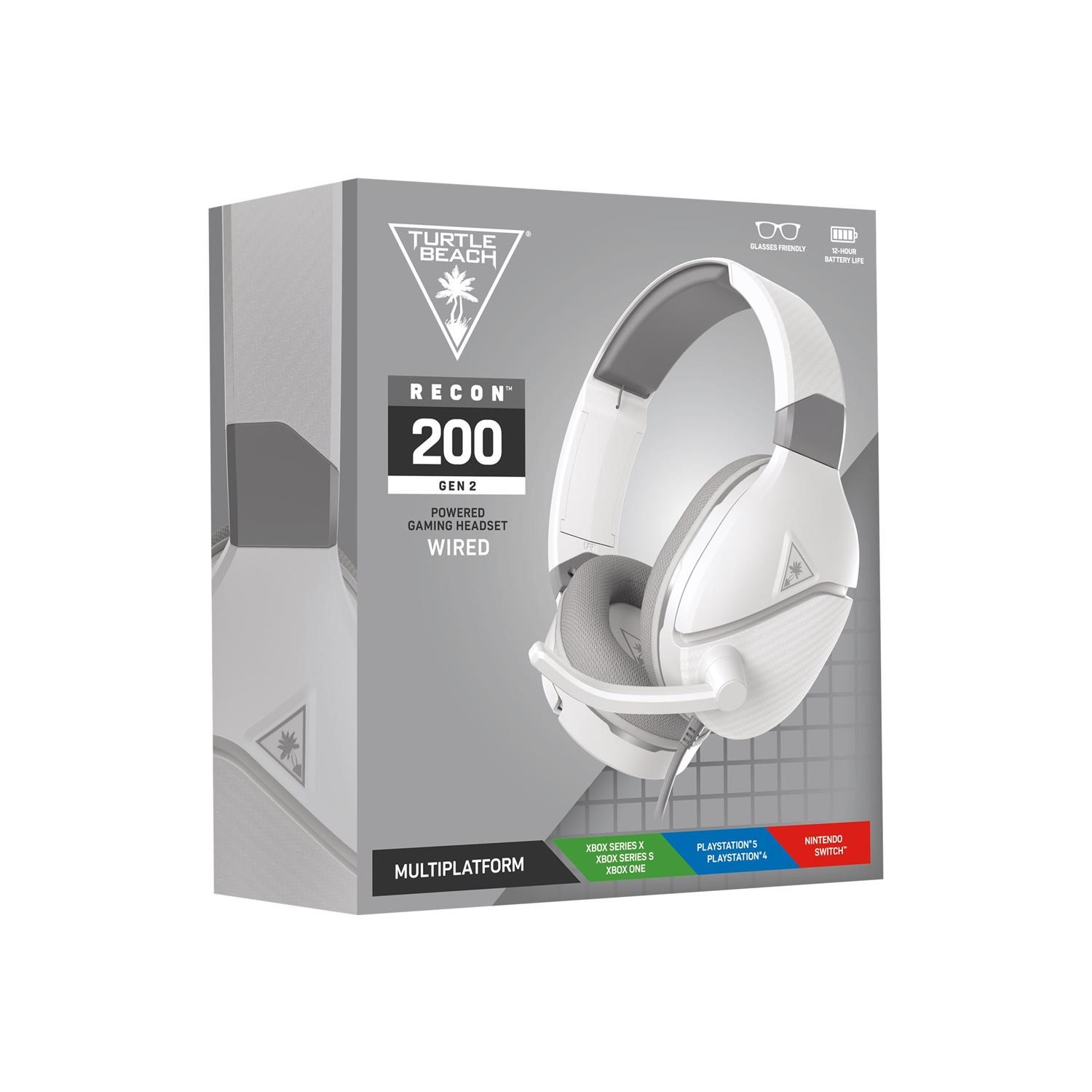 Powered by a rechargeable 12-hour battery, the Turtle Beach Recon 200 Gen 2 multiplatform gaming headset delivers powerful, amplified audio with bass boost and variable mic monitoring so you can hear the volume of your voice in the headset. 12 hours can go by quickly, so the Recon 200 Gen 2 can keep going without power in passive mode for game audio. Whether you're chatting with teammates or trash-talking the enemy, the high-sensitivity flip-to-mute mic picks up your comms loud and clear. Ultra-soft memory foam ear cushions with ProSpecs and a strengthened, metal-reinforced headband provides plush comfort and durability over hours of gaming.